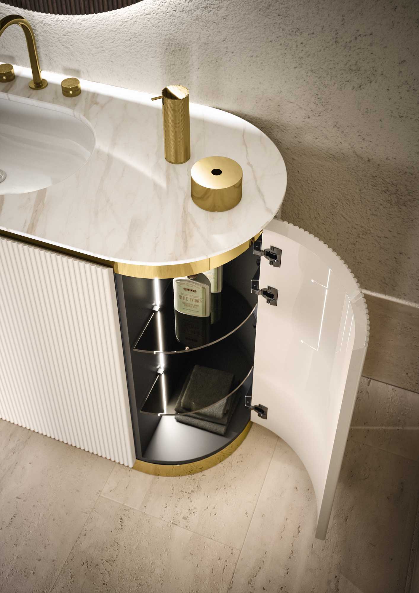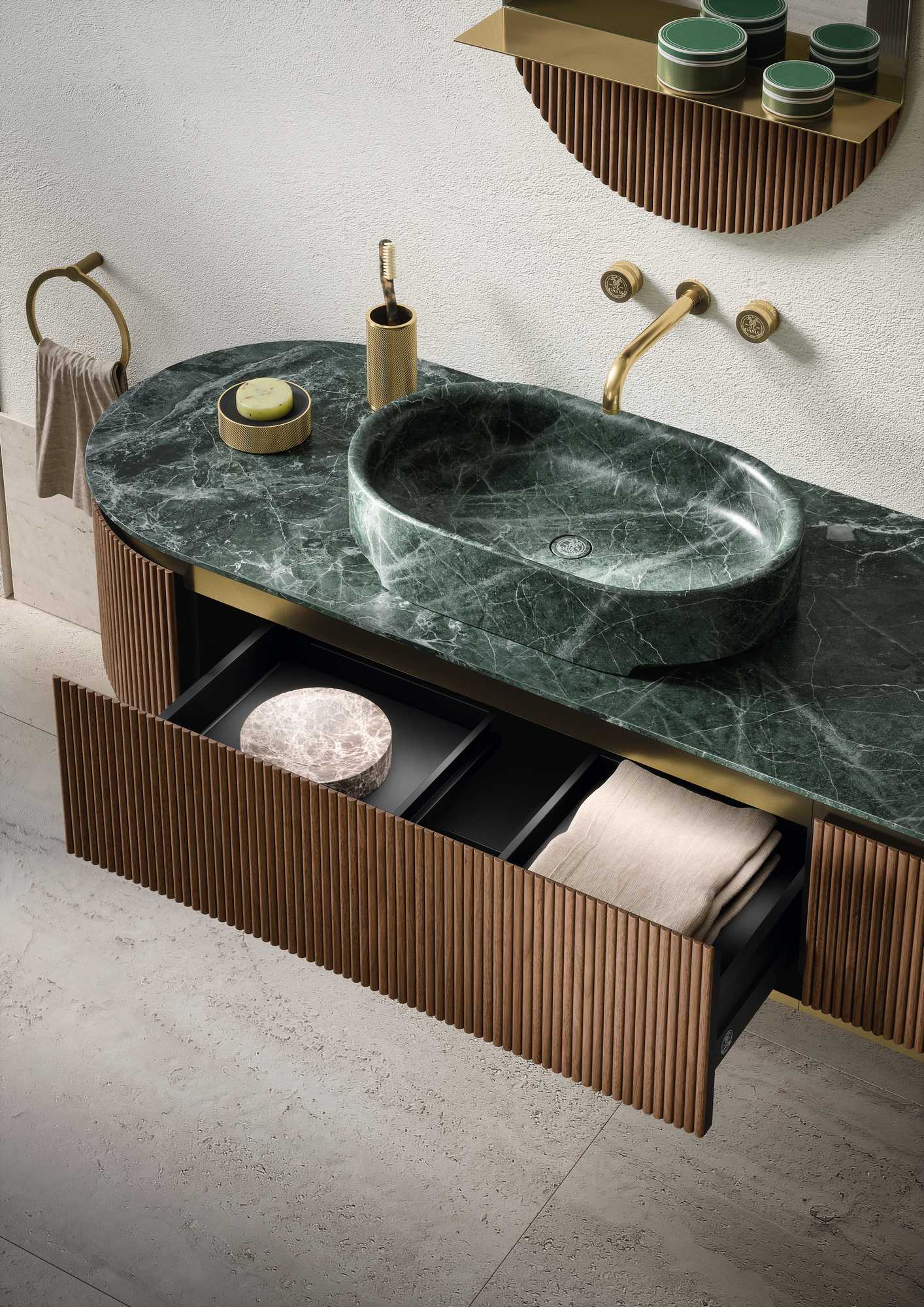Мягкий силуэт и отделка из натуральных материалов придают ощущение тепла и естественности. Столешницы из мрамора отсылают нас к искусству и грандиозности древних цивилизаций.