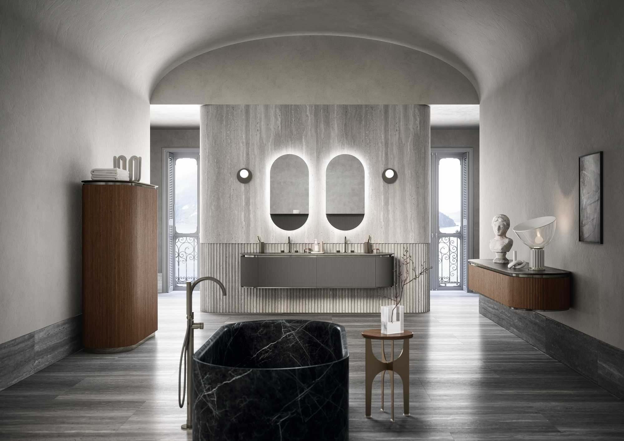 В коллекцию Nàos входят также зеркала, высокие, просторные и стильные тумбы, светильники, а также цилиндрические комоды, напоминающие древнегреческие колонны. Все элементы гармонично сочетаются друг с другом.