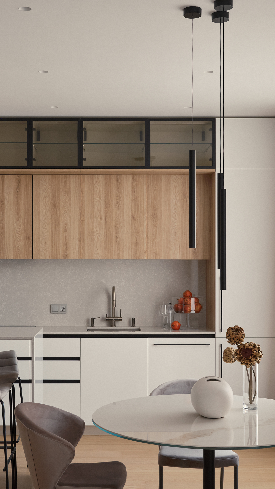 Фартук кухни, столешница, а также барная стойка выполнены из кварцевого агломерата, этот материал на 97% состоит из минерального кварца, одного из самых твердых материалов в природе.