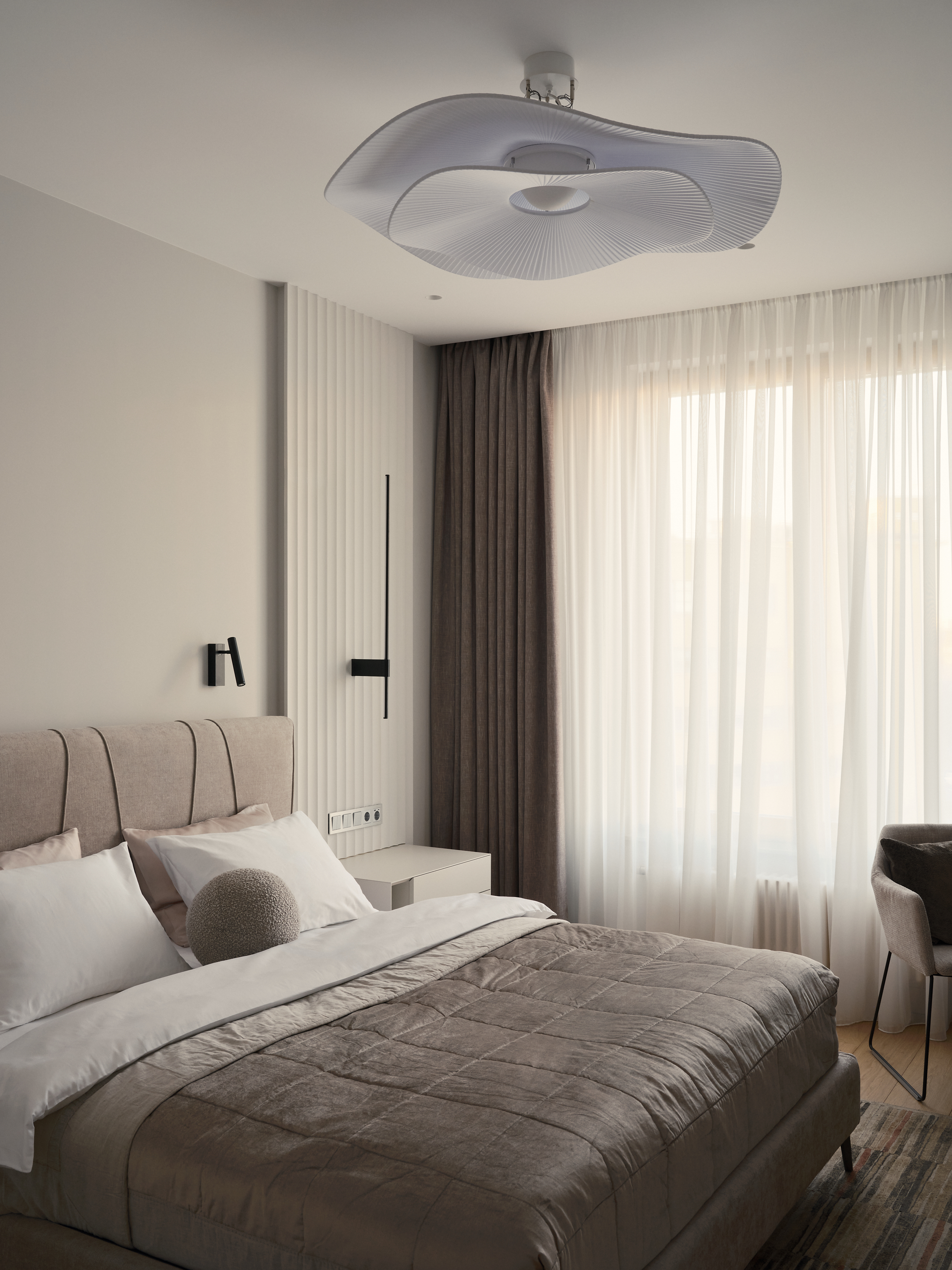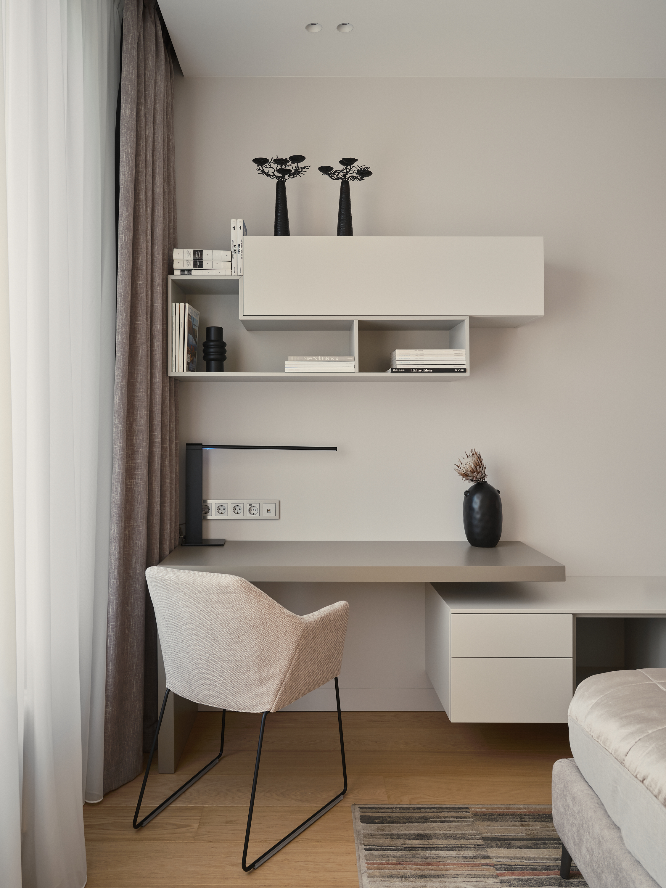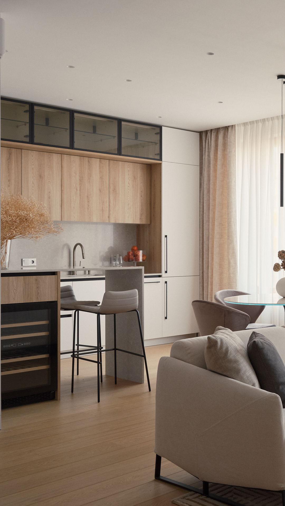 Лаконичный интерьер квартиры выполнен в спокойных, фоновых тонах cтен, корпусной и мягкой мебели. Это прекрасная основа, которую можно разнообразить цветом и формами с помощью декоративных элементов.