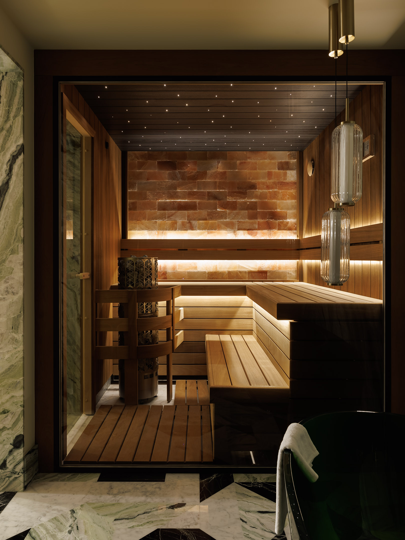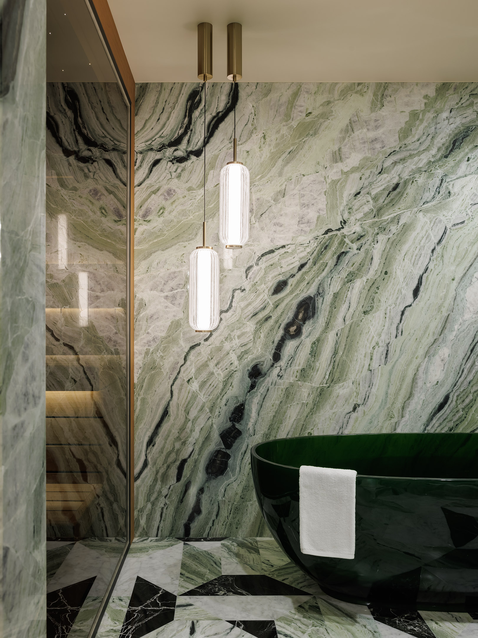 Фото реализованного проекта Елены Куртиной и Жанны Тульновой. Главный акцент здесь – отдельностоящая ванна из цветной полиэфирной смолы, которая гармонично перекликается с акцентным ониксом. Идеально подходит для расслабления до и после банных процедур, поскольку ванная комната совмещена с сауной.