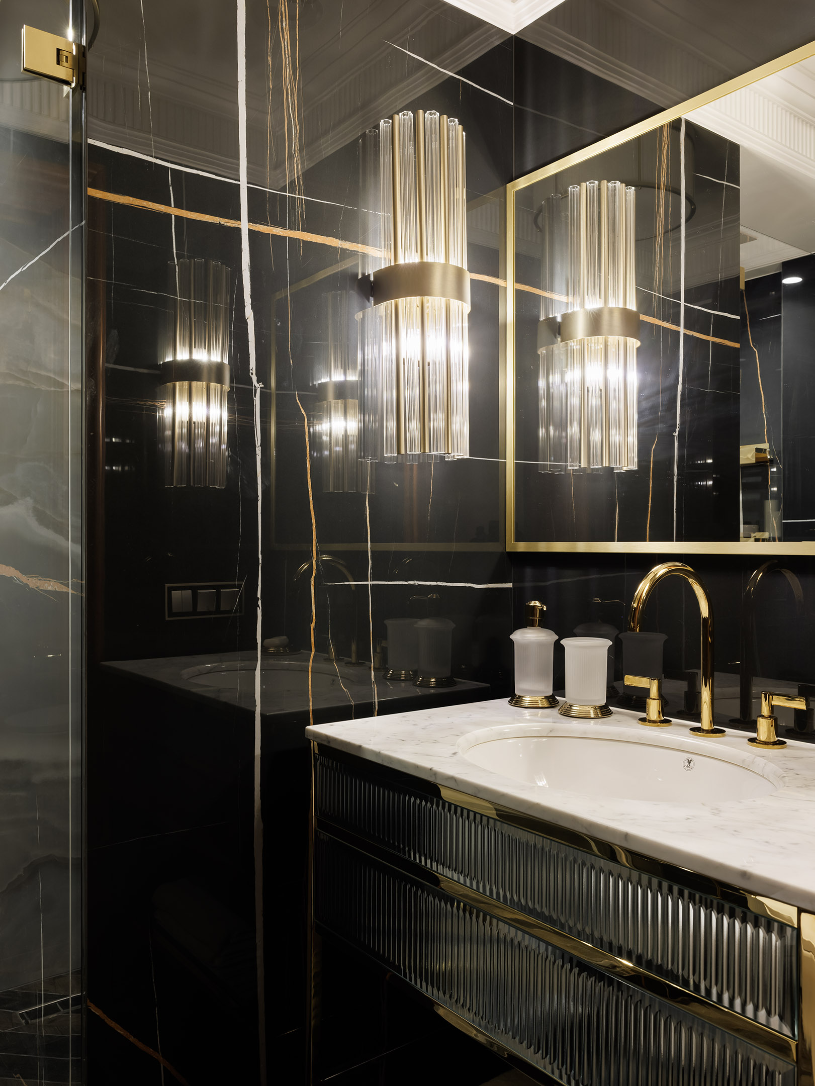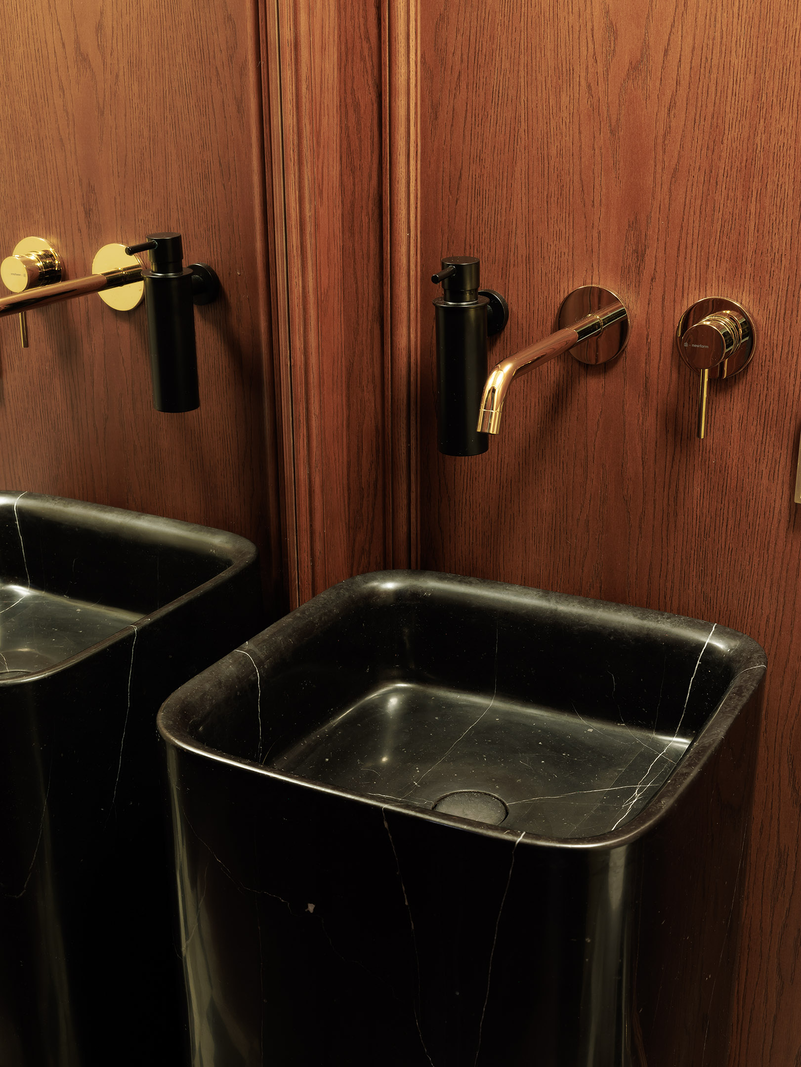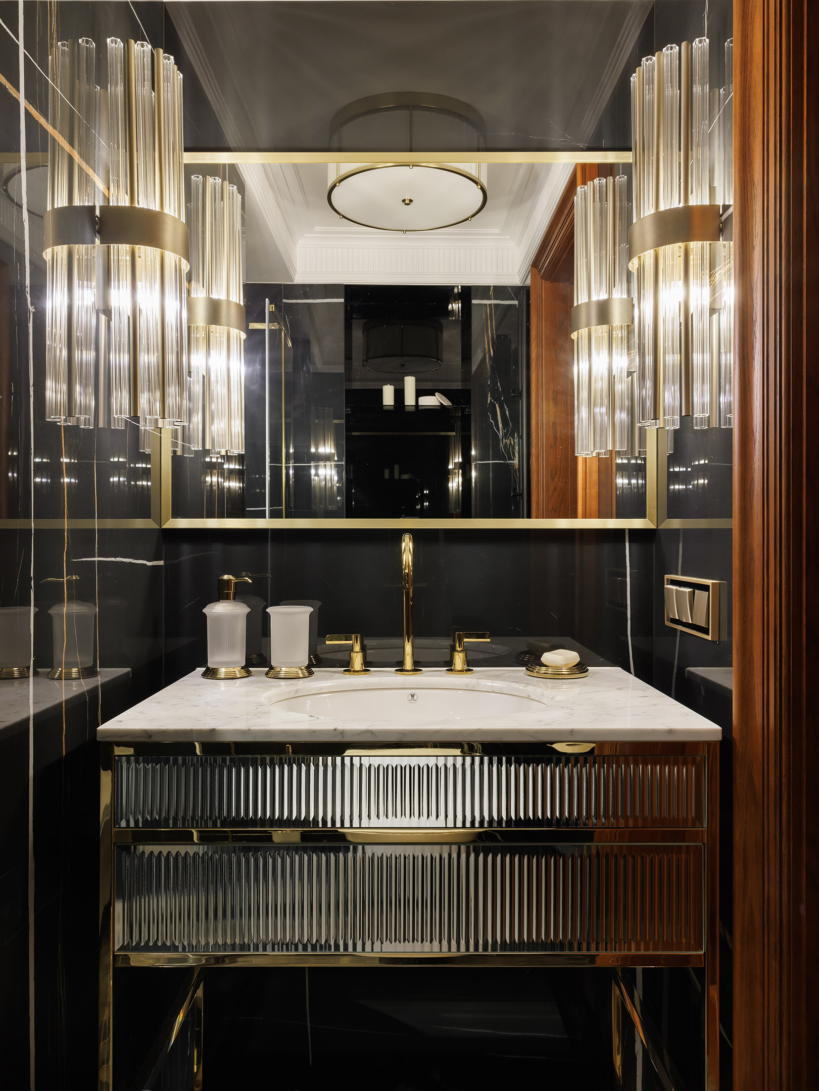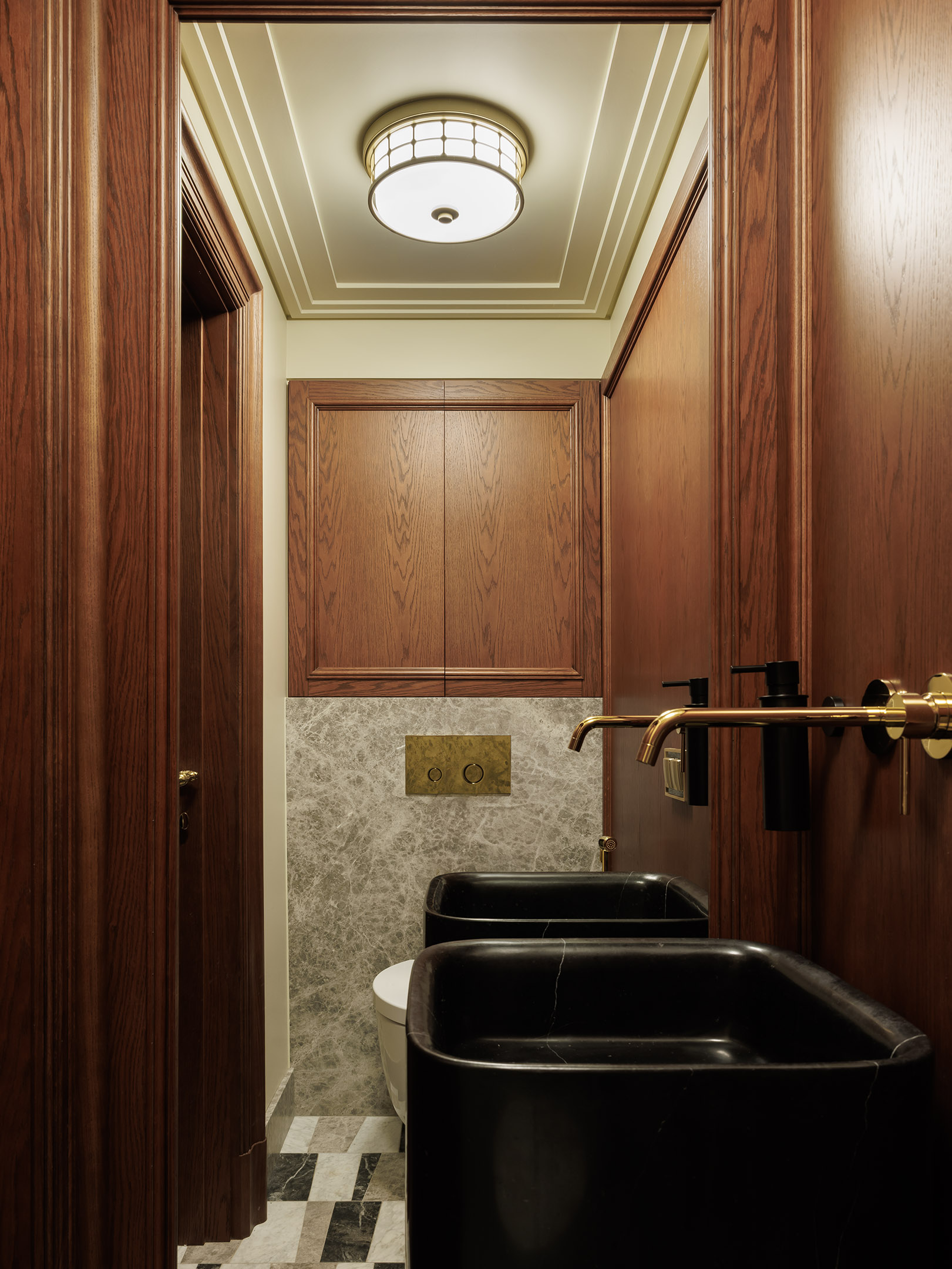 В гостевом санузле гостей встречает раковина из мрамора Nero Marquina. Камень привезен из Испании. Дополнена смесителями итальянского бренда NewForm.